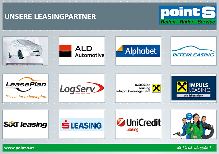 Als Partner von point-S sind wir für Sie da, wenn es um die Betreuung Ihrer Fahrzeugflotte im Raum Perg geht. Komplette Reifenbetreuung bieten wir auch für Leasingautos zum Beispiel von der Porschebank, Raiffeisen Leasing und vielen anderen.